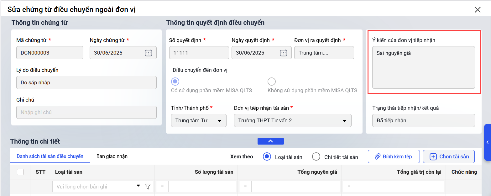 Lưu ý: Đối với tài sản hạ tầng đường bộ (Tài sản HT-ĐB) và tài sản hạ tầng cấp nước sạch (Tài sản HT-CNS) thì anh/chị không lập chứng từ điều chuyển được mà sẽ xuất file excel danh sách tài sản hạ tầng để nhập khẩu vào đơn vị mới.