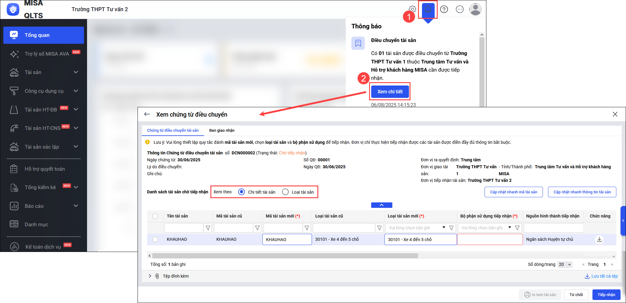 Bước 1: Xem chi tiết chứng từ tiếp nhận tài sản từ đơn vị khác