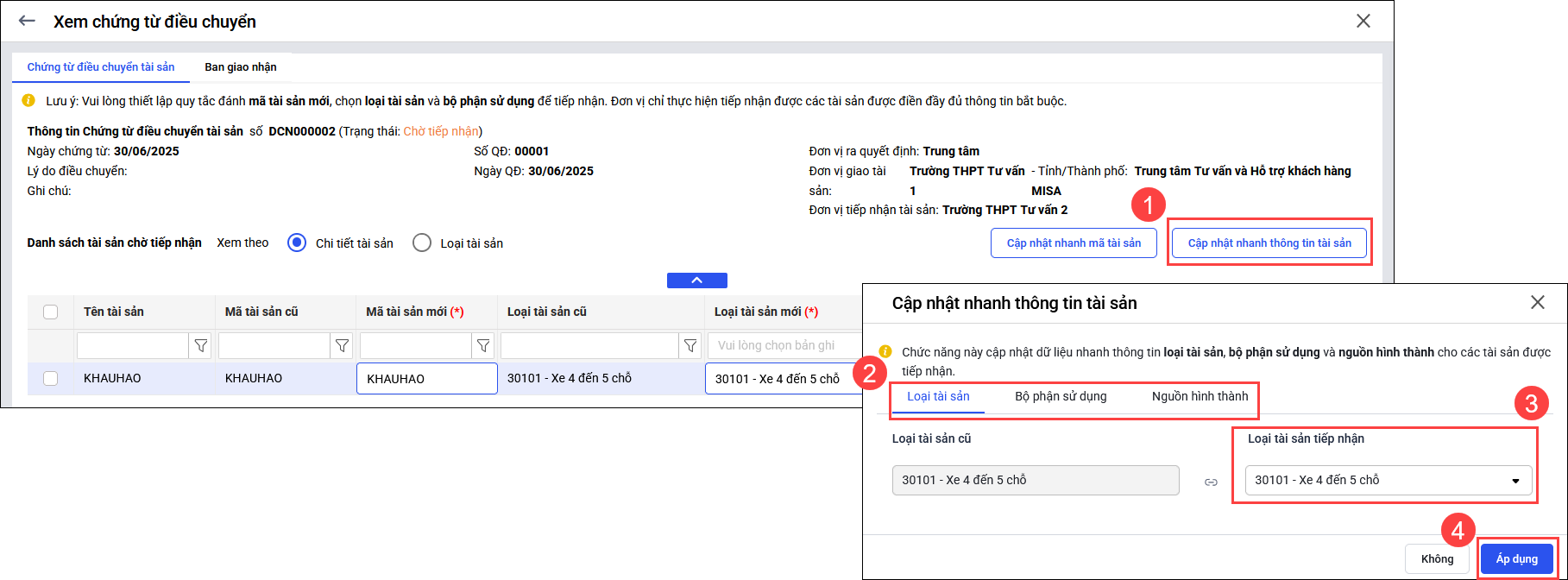 Bước 2: Thiết lập nhanh thông tin cho tài sản tiếp nhận