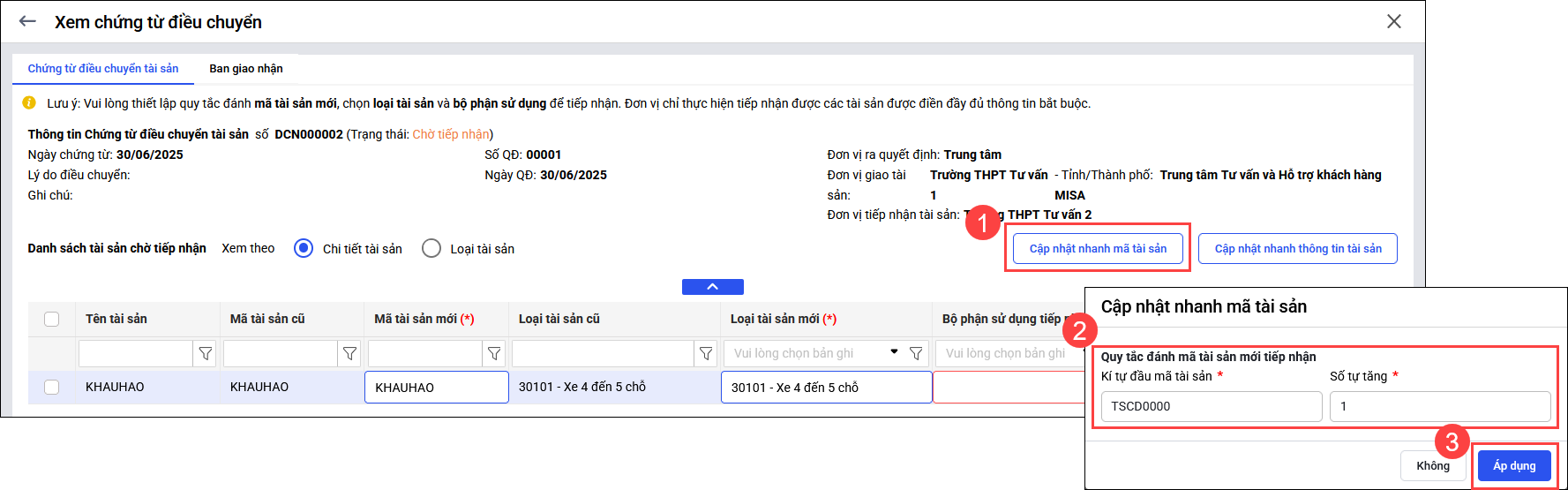 • Giữ nguyên mã tài sản cũ: Nếu anh/chị muốn giữ lại mã tài sản từ đơn vị bàn giao, chỉ cần không nhấn chức năng Cập nhật nhanh mã tài sản, hệ thống sẽ tự động giữ nguyên toàn bộ mã tài sản cũ, không sinh mã mới.