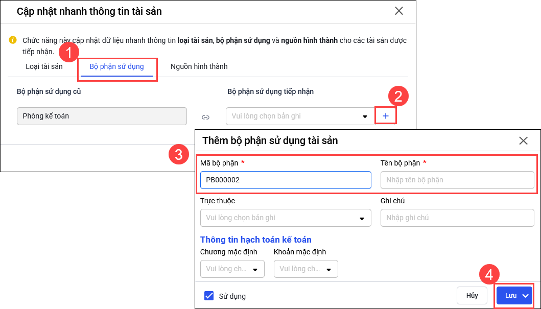 • Lưu ý: Trường hợp Phòng ban (Bộ phận) của đơn vị mới chưa khai báo, đơn vị thực hiện chọn qua tab Bộ phận sử dụng, tích dấu + để khai báo.