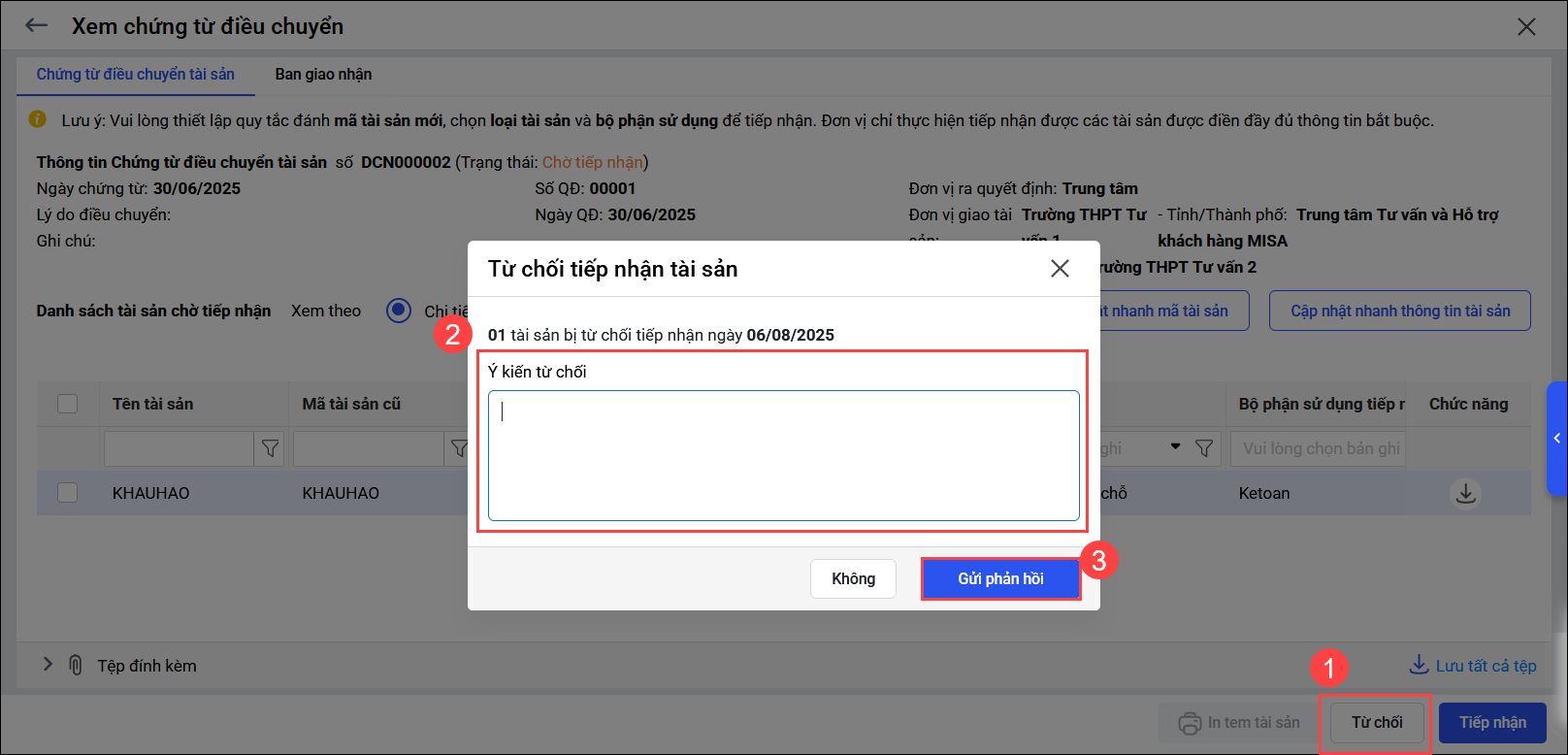 • Nhấn chọn Từ chối, Nhập lý do từ chối, sau đó nhấn Gửi phản hồi. Tài sản sẽ chuyển thành trạng thái Đã từ chối và gửi thông báo cho đơn vị điều chuyển tài sản để kiểm tra lại.