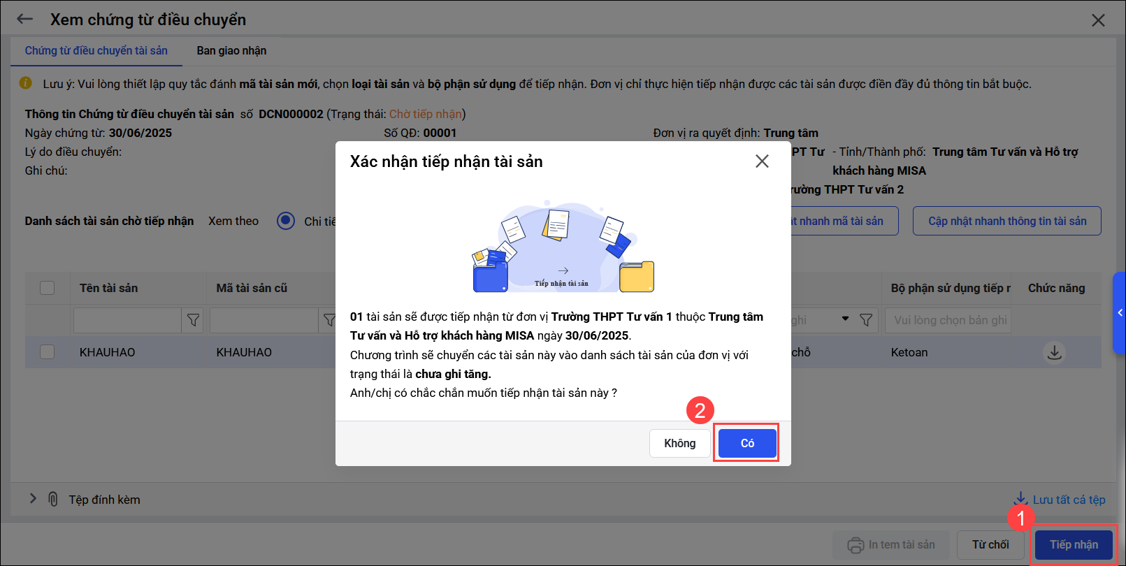 • Sau khi kiểm tra tất cả danh sách tài sản và muốn tiếp nhận tài sản, anh/chị chọn Tiếp nhận, chọnđể xác nhận.