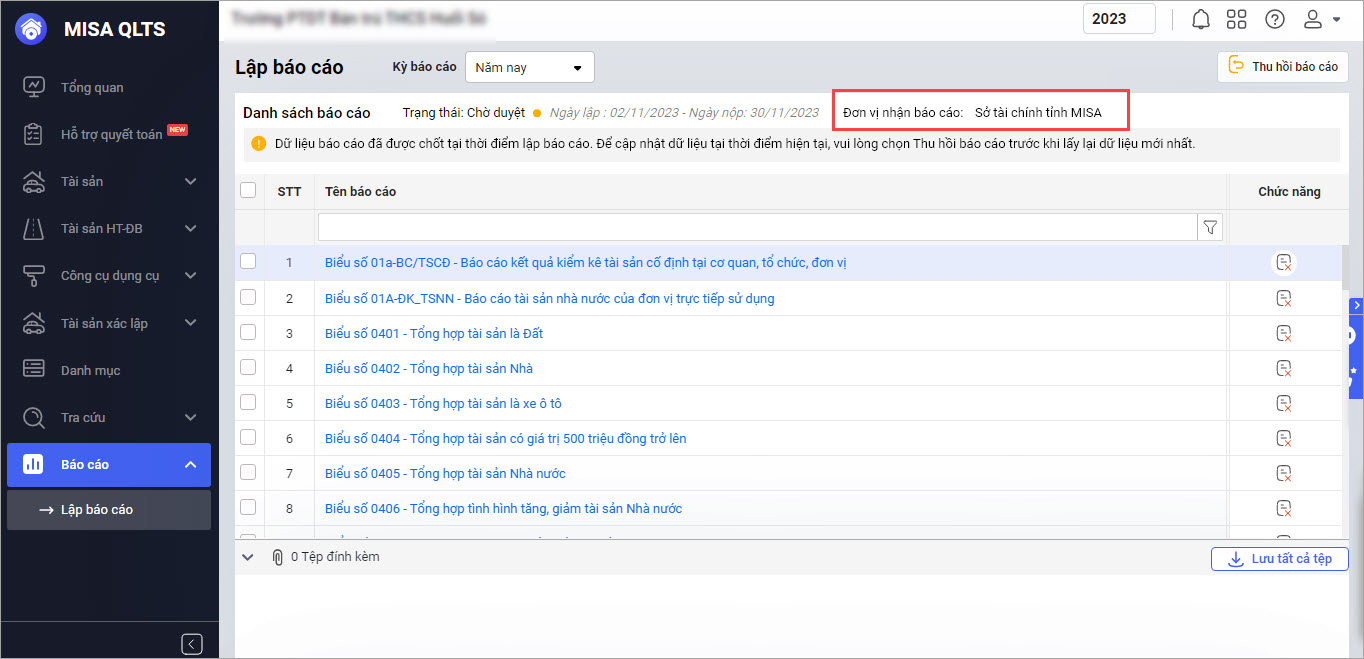 Tại menu Báo cáo\Lập báo cáo: Đối với đơn vị thay đổi Đơn vị nhận báo cáo, sau khi thu hồi báo cáo và thực hiện nộp lại thì thực hiện chuyển đúng các báo cáo tới đơn vị nhận báo cáo mới.