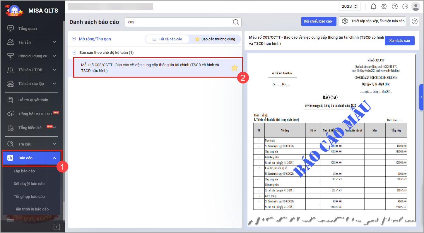 Phần mềm cho phép cập nhật TT23/2023/TT-BTC, sau đó chuyển loại tài sản từ loại IV. TSCĐ đặc thù sang loại I. TSCĐ đặc thù. Khi in báo cáo C03 tại tham số báo cáo nếu chọn Tổng hợp chung thì thấy bị lệch số đầu năm 2023 và số cuối năm 2022