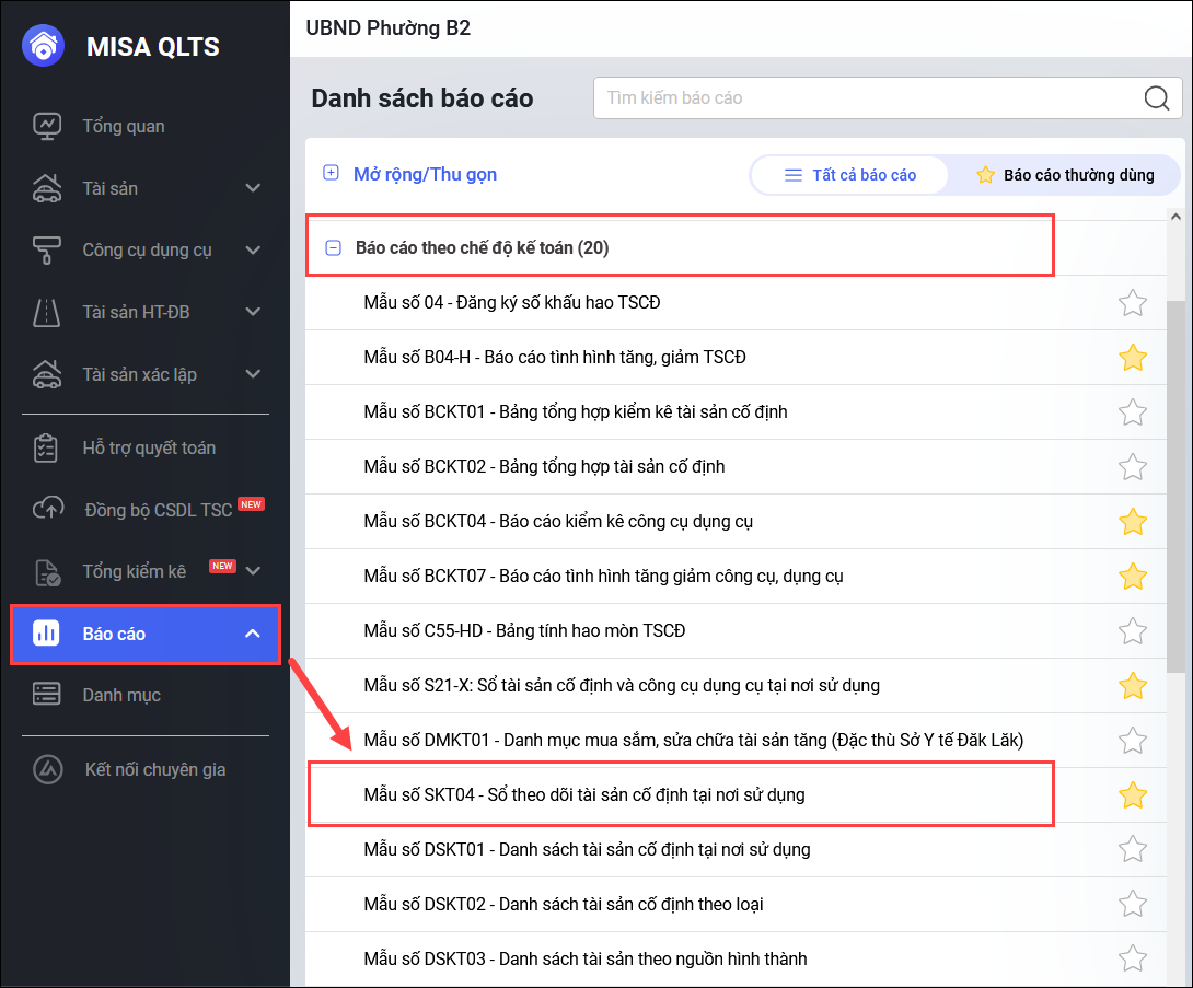 Bước 1: Vào menu Báo cáo\Báo cáo quản trị\chọn Mẫu số SKT04 – Sổ theo dõi tài sản cố định tại nơi sử dụng.