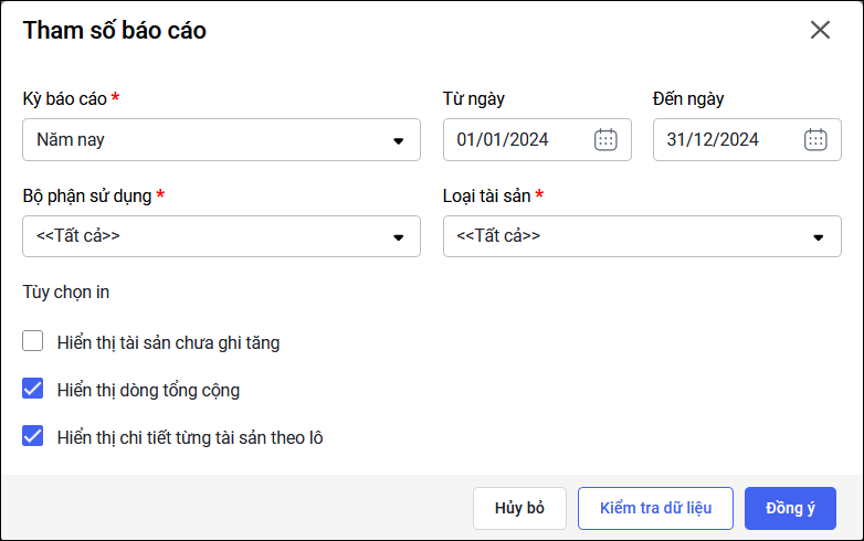 - Hiển thị tài sản chưa ghi tăng: Tích chọn nếu muốn hiển thị cả tài sản chưa ghi tăng lên báo cáo.