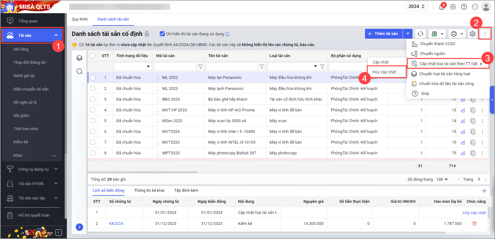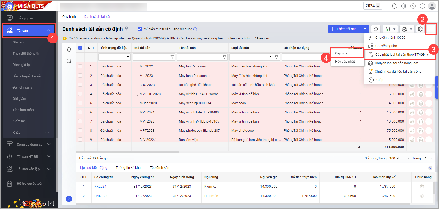 Tại màn hình Danh sách tài sản cố định, nhấn vào biểu tượng dấu ba chấm, chọn Cập nhật loại tài sản theo TT/QĐ, sau đó chọn Cập nhật để cập nhật quyết định số 44/2024/QĐ-UBND