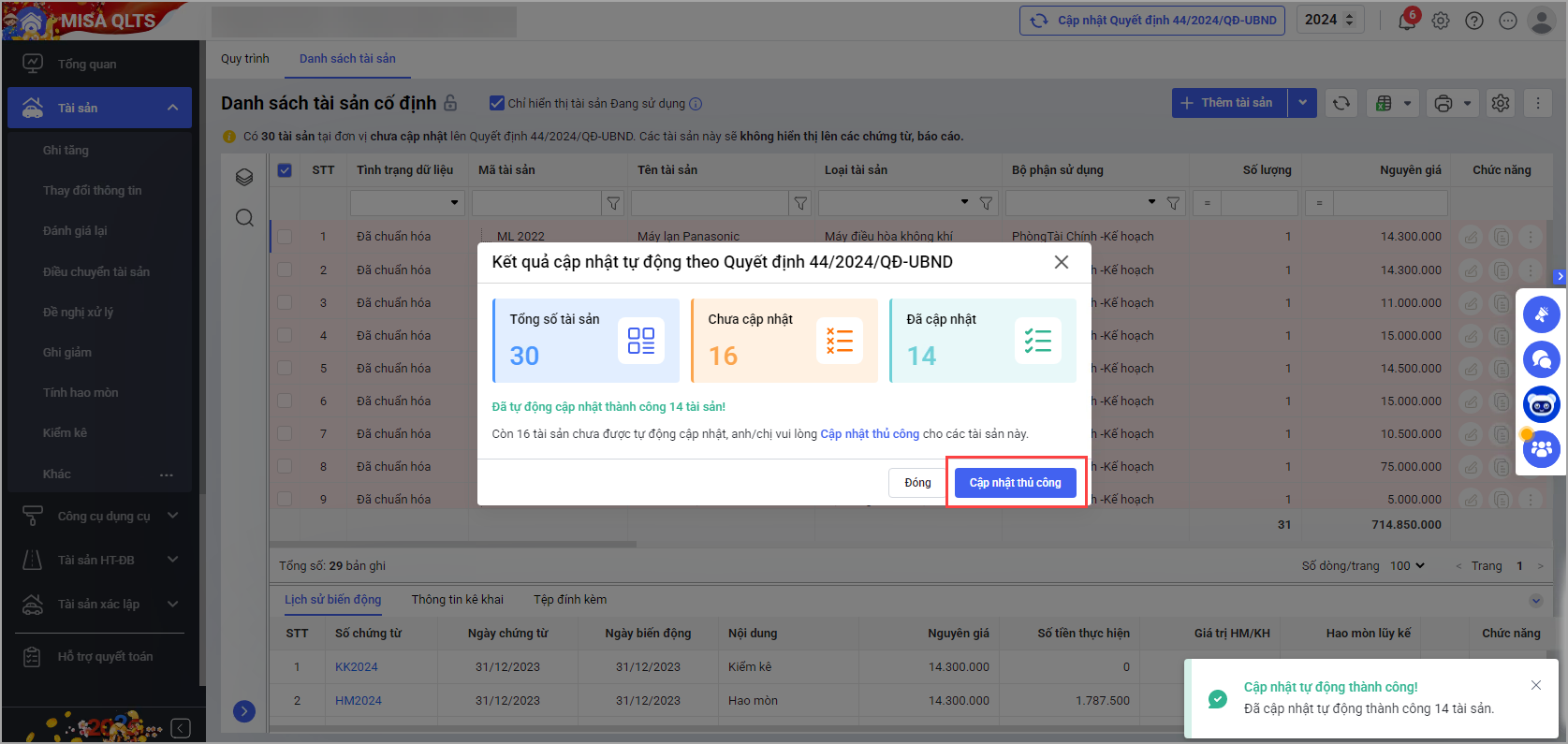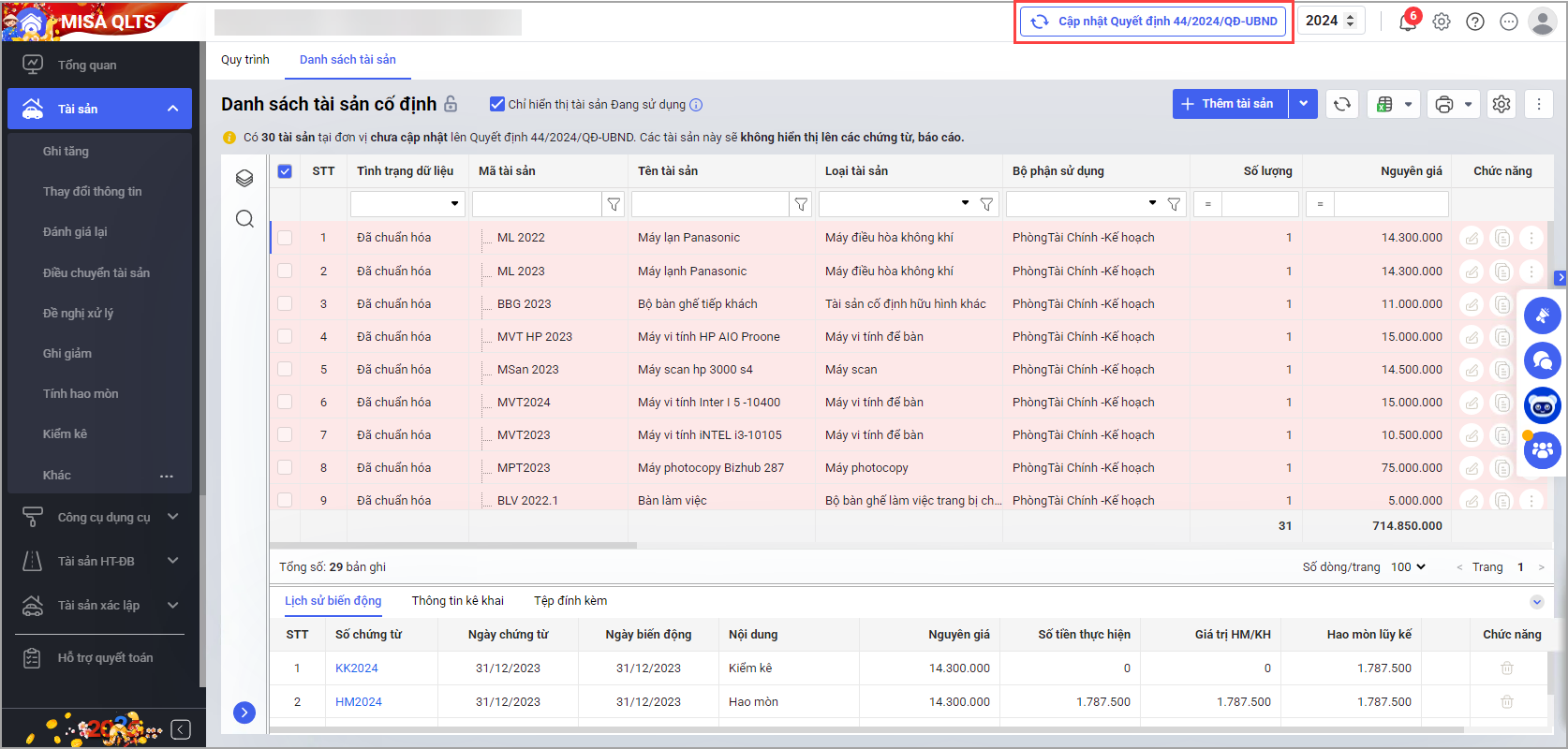 • Hoặc tại màn hình Danh sách tài sản cố định chọn Cập nhật quyết định số 44/2024/QĐ-UBND