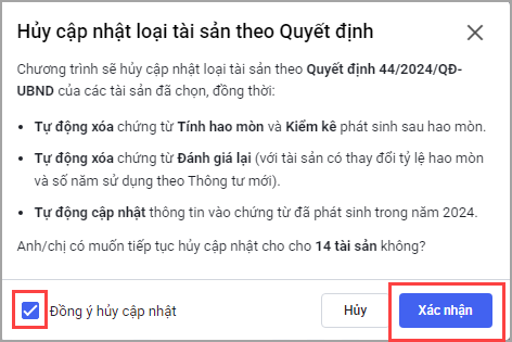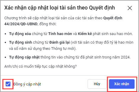 Tích chọn Đồng ý cập nhật và chọn Xác nhận để đồng ý cập nhật tài sản theo thông tư mới.