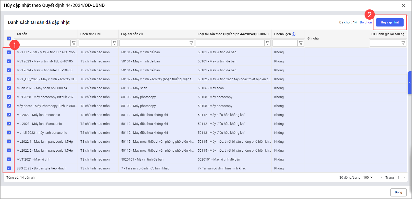 • Phần mềm hiển thị danh sách tài sản cần hủy chuyển đổi. Tích chọn tài sản và nhấn Hủy cập nhật.