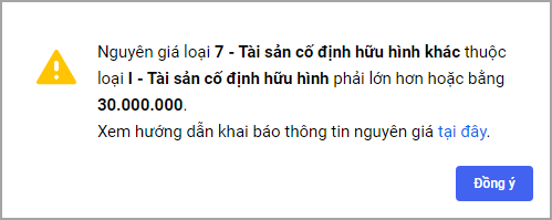 - Khi khai báo tài sản có Nguyên giá < 30 triệu, hiển thị cảnh báo, anh/chị chọn Tại đây để xem hướng dẫn khai báo thông tin nguyên giá. Anh/chị chọn Đồng ý để nhập lại nguyên giá của tài sản