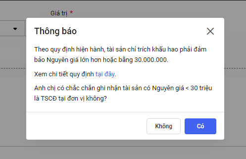 - Khi khai báo tài sản Chỉ trích khấu hao có Nguyên giá < 30 triệu, phần mềm hiển thị cảnh báo.