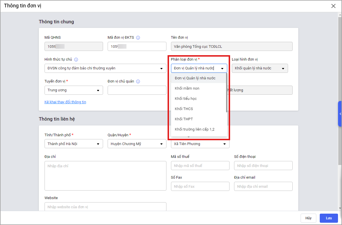 Thay đổi lại thông tin phân loại đơn vị để kết nối với phần mềm QLTSC.