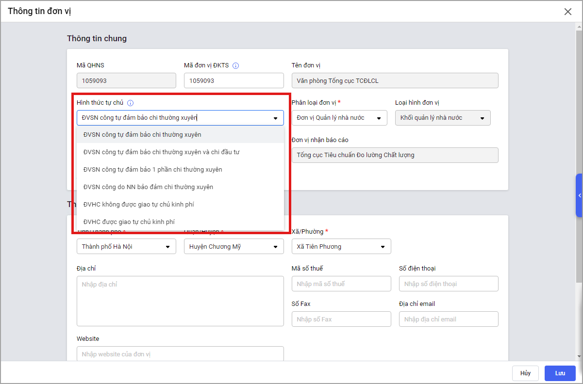 2. Loại bỏ giao diện Thiết lập loại hình đơn vị, gộp 5 thông tin trên giao diện này thành 1 thông tin Loại hình đơn vị và bổ sung vào Thông tin đơn vị: