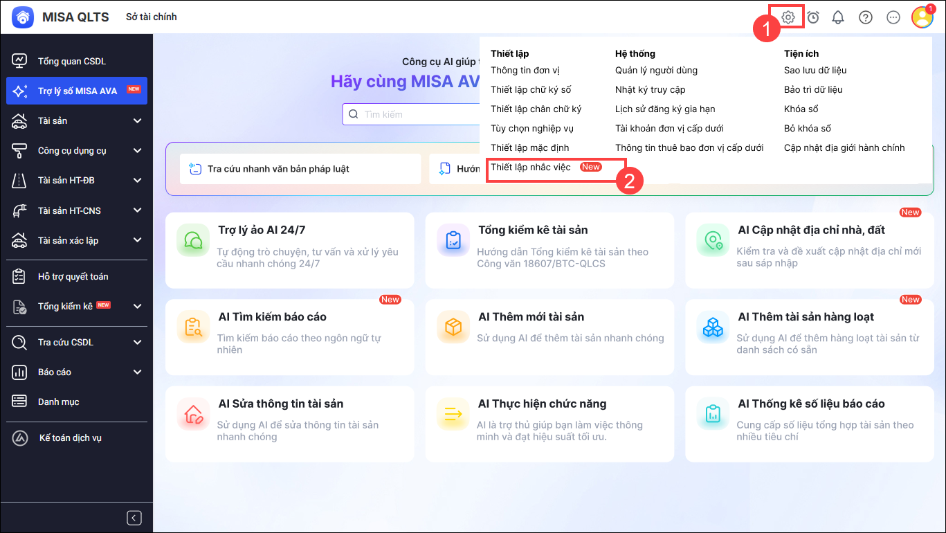 1. Vào biểu tượng cài đặt nhấn Thiết lập nhắc việc
