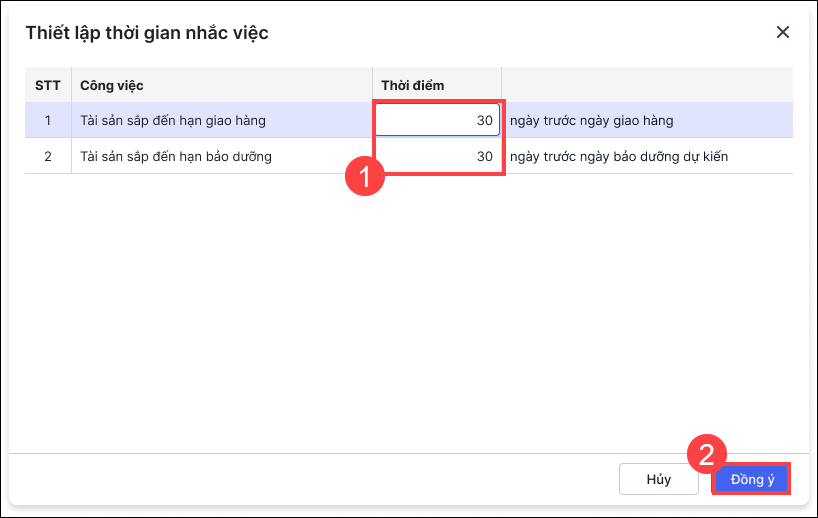 2. Anh/chị nhập thời gian để hệ thống gửi thông báo trước khi đến ngày giao hàng hoặc ngày bảo dưỡng dự kiến. Sau đó nhấn Đồng ý.