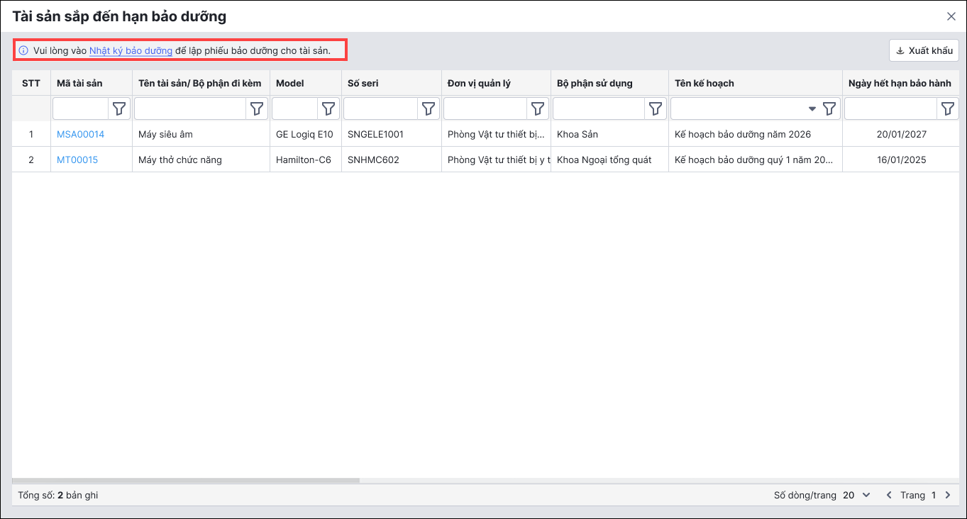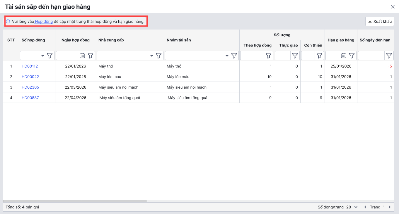 2. Theo dõi số lượng tài sản sắp đến hạn giao hàng và đến hạn bảo dưỡng