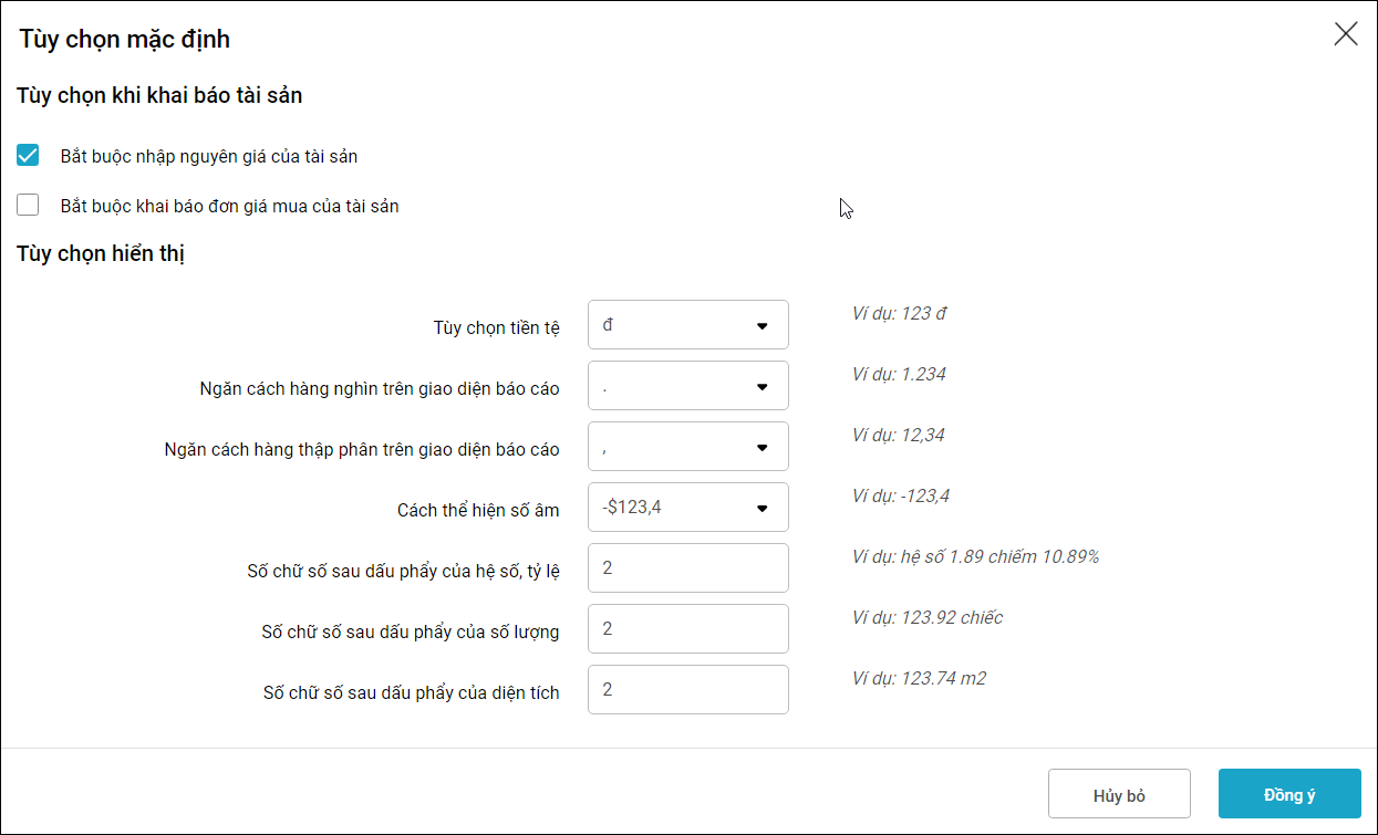 - Số chữ số sau dấu phẩy của hệ số, tỷ lệ: hiển thị loại nào thì số chữ số sau dấu phẩy của các trường thông tin là hệ số/tỷ lệ sẽ hiển thị số chữ số sau dấu phẩy theo tùy chọn.
