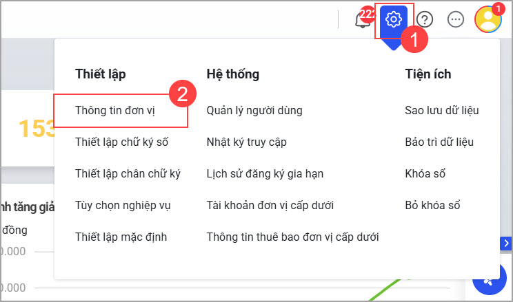 Bước 1: Tại phần Thiết lập ⚙\Thông tin đơn vị (biểu tượng Thiết lập có hình bánh răng cưa ⚙ trên góc trên bên phải giao diện phần mềm)