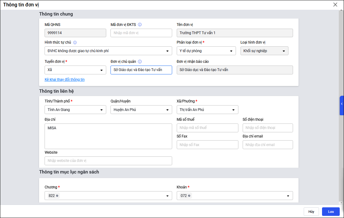Bước 3: Sau khi hoàn tất, nhấn Lưu để hoàn tất khai báo thông tin đơn vị.