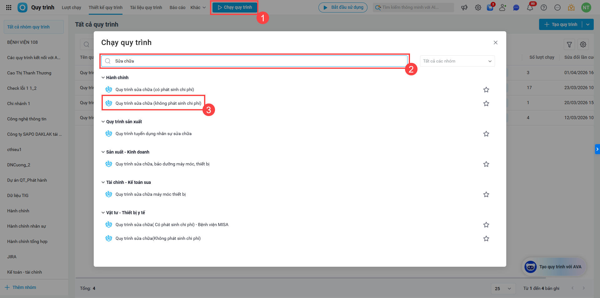 1. Nhấn Chạy quy trình. Anh/chị nhập tên quy trình tại ô tìm kiếm để thực hiện tìm kiếm nhanh quy trình đã thiết lập