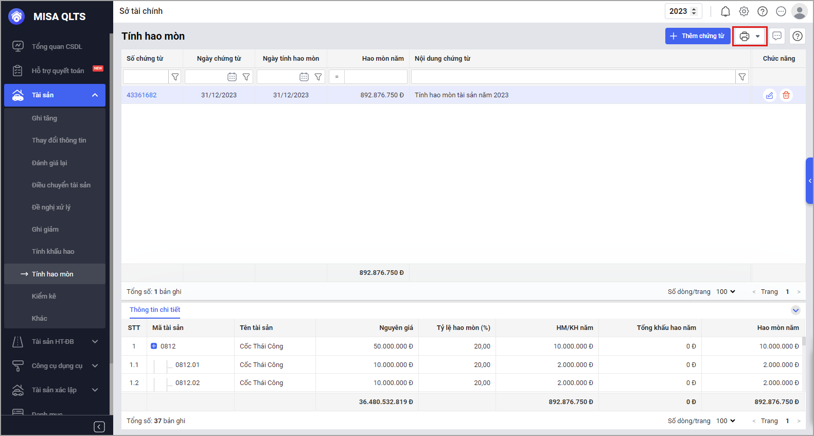 3.3. Làm thế nào để kết xuất chứng từ tính hao mòn tài sản ra file PDF/excel?