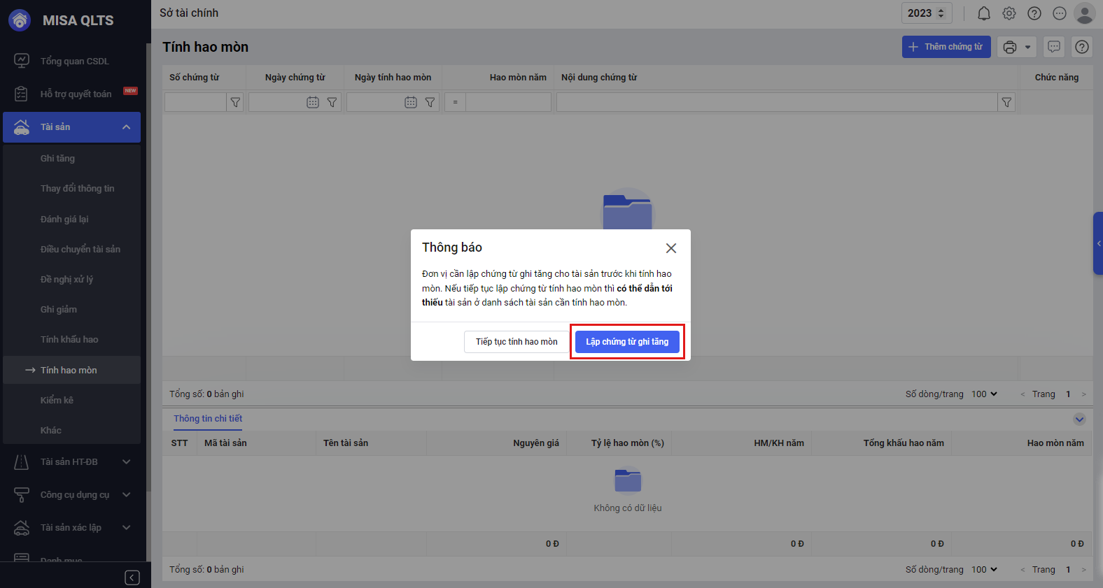 Lưu ý: Anh/chị cần lập chứng từ ghi tăng cho tất cả các tài sản, nếu tiếp tục lập chứng từ tính hao mòn thì có thể dẫn tới thiếu tài sản ở danh sách tài sản cần tính hao mòn.