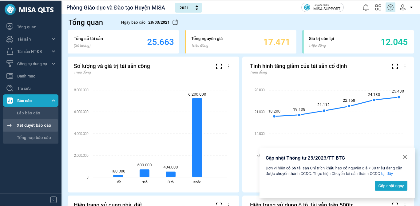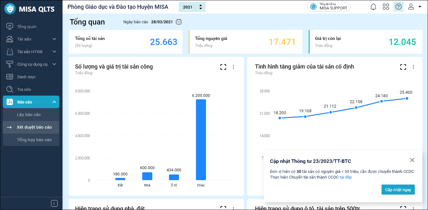 - MISA QLTS cập nhật các quy định về quản lý tài sản theo Thông tư 23/2023/TT-BTC mới ban hành thay thế Thông tư 45/2018/TT-BTC. Chi tiết tại đây.