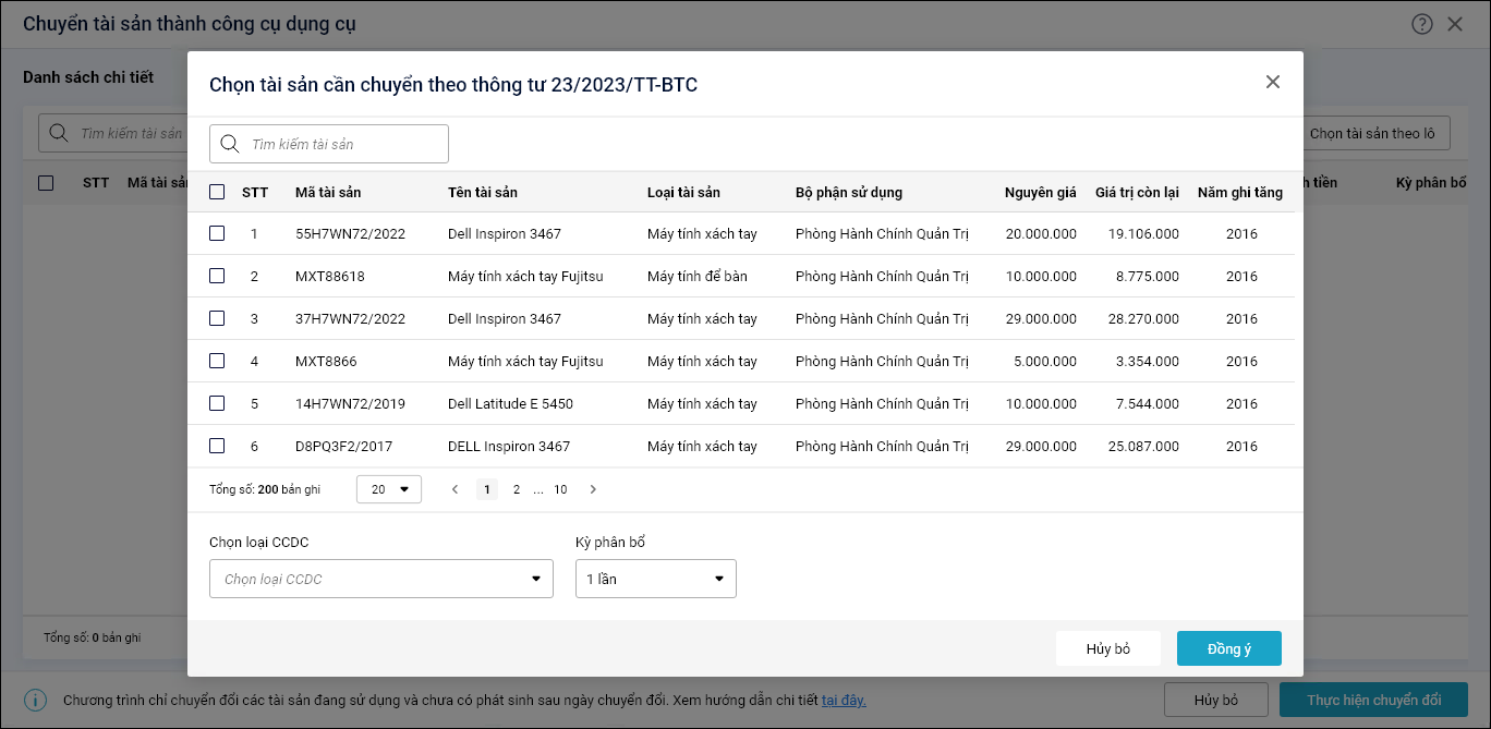 - Khi nhấn Cập nhật ngay sẽ điều hướng đến màn Chuyển tài sản thành công cụ dụng cụ, hiển thị sẵn danh sách các tài sản cần chuyển đổi theo quy định tại Thông tư với điều kiện: