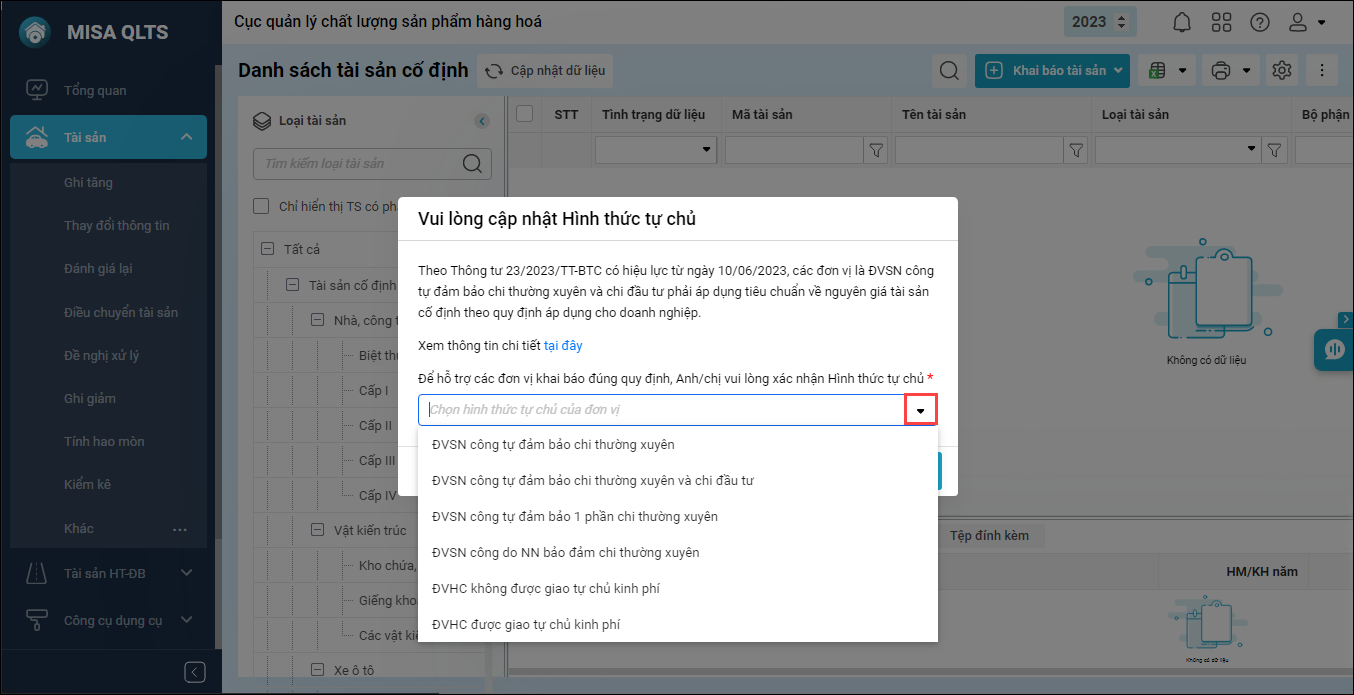 2. Cán bộ QLTS mong muốn cập nhật chính xác Hình thức tự chủ của đơn vị để tính toán đúng khấu hao theo quy định tại Thông tư 23/2023/TT-BTC