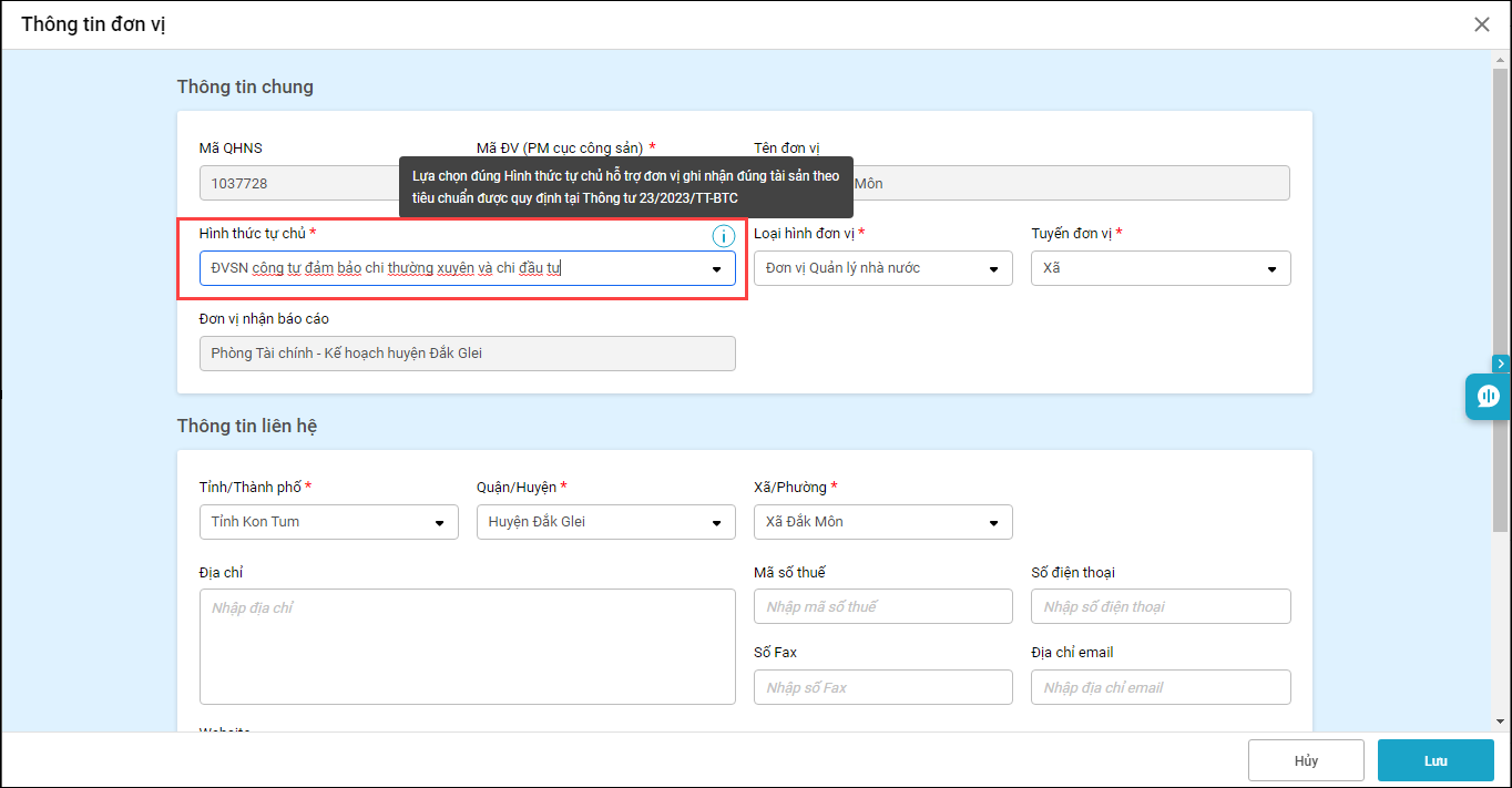 - Với đơn vị chưa cập nhật đầy đủ các thông tin bắt buộc trên Thông tin đơn vị: Hiển thị form Thông tin đơn vị để người dùng khai báo. Trong đó bổ sung thông tin Hình thức tự chủ là bắt buộc nhập kèm chú thích.