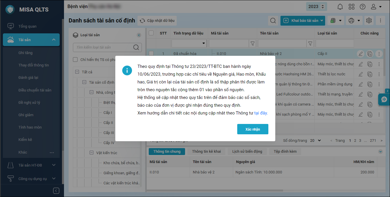 - Khi đăng nhập vào phần mềm, cán bộ QLTS nhận thông báo về việc cập nhật Quy tắc làm tròn số tiền theo Thông tư 23/2023/TT-BTC để nắm bắt và xem các nội dung cập nhật theo Thông tư mới.