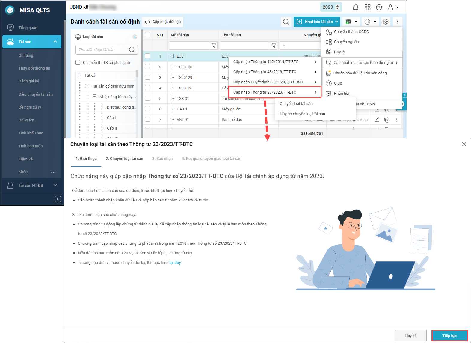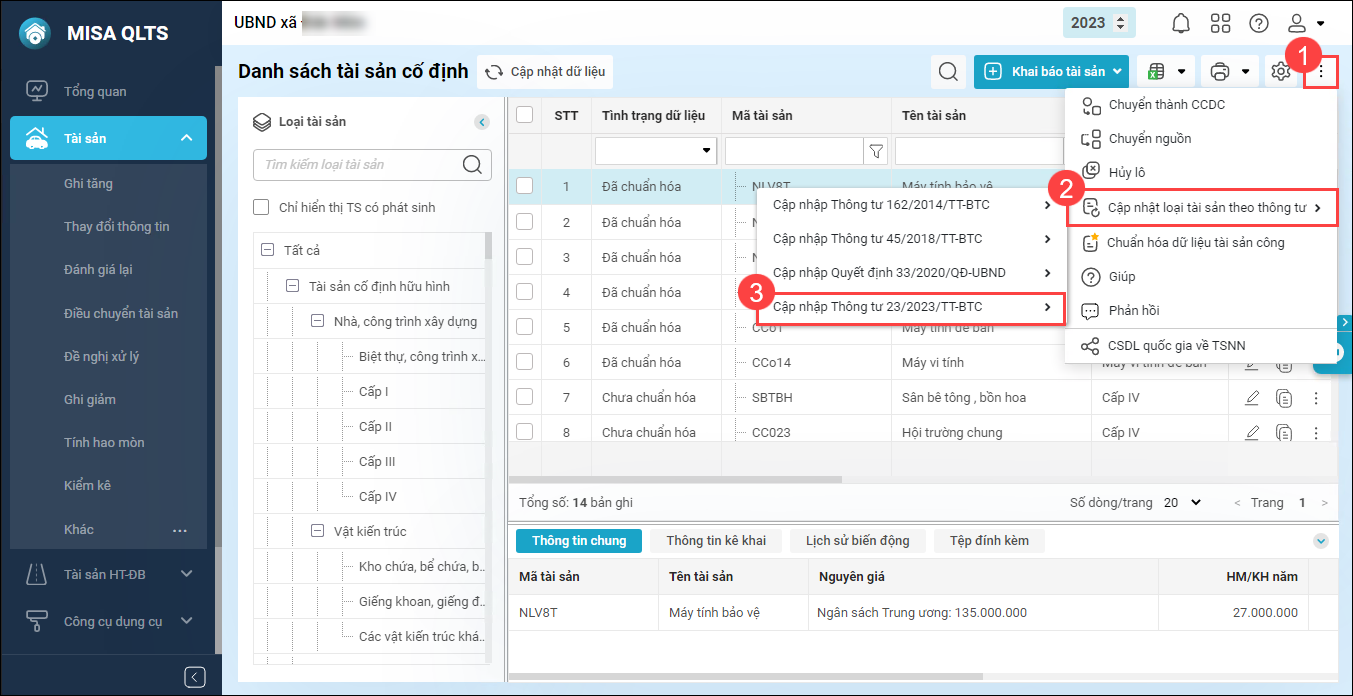 - Tại Tài sản\Cập nhật loại tài sản theo thông tư\Cập nhật Thông tư 23/2023/TT-BTC: