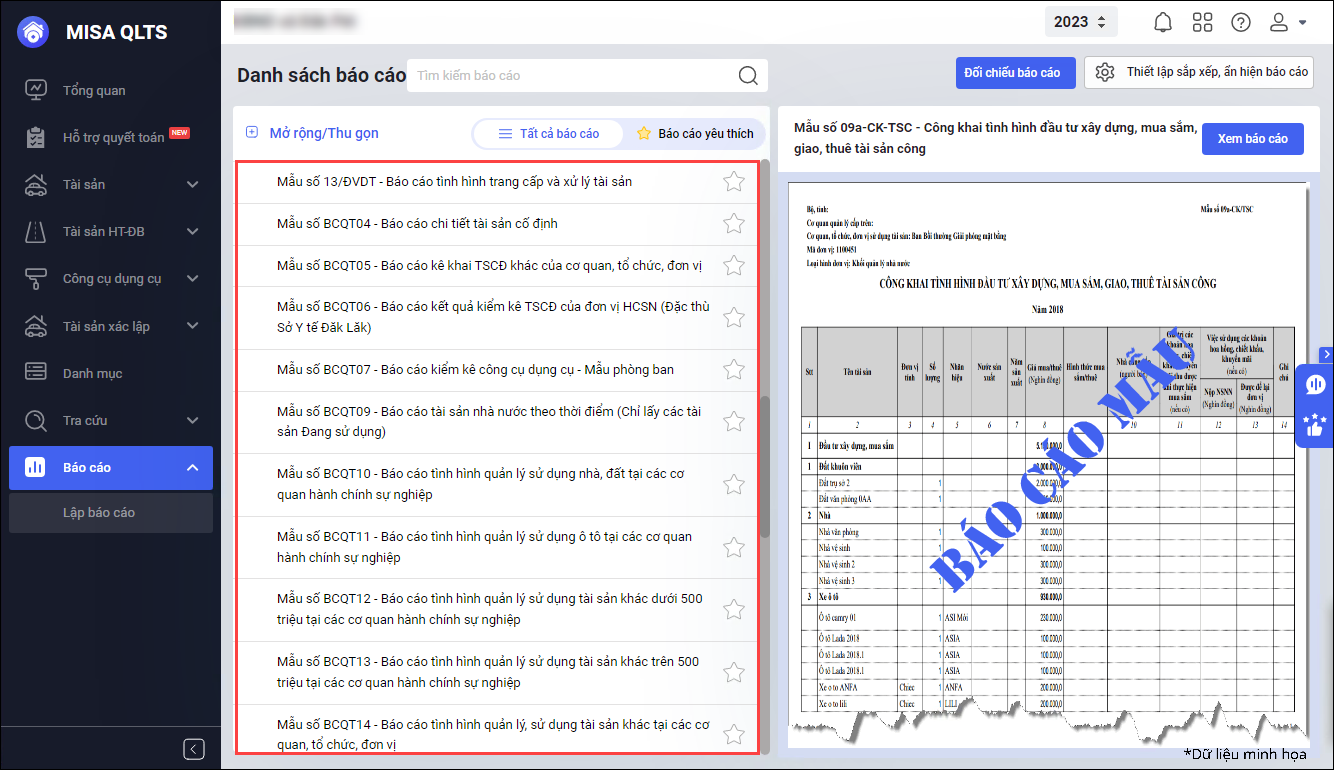 • Tại Báo cáo\Danh sách báo cáo, phần mềm đáp ứng trên tên báo cáo có bao gồm mã báo cáo của các loại: Báo cáo công khai; Báo cáo kê khai TSNN;… Chưa đáp ứng tất cả các báo báo thuộc: Báo cáo theo chế độ kế toán; Báo cáo quản trị.