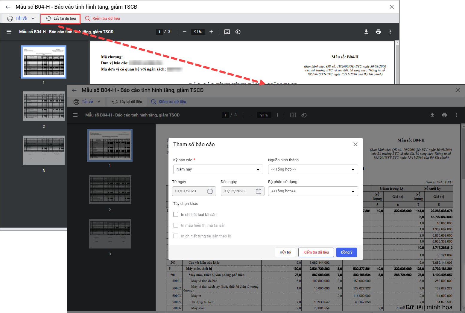 • Tại Báo cáo\Danh sách báo cáo\Xem báo cáo: Bổ sung nút Lấy lại dữ liệu, khi chọn sẽ hiển thị form Tham số báo cáo để anh/chị chọn lại.