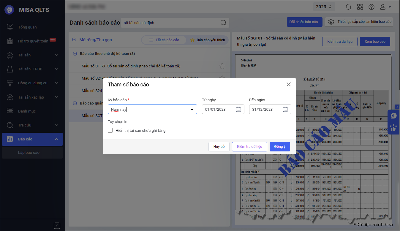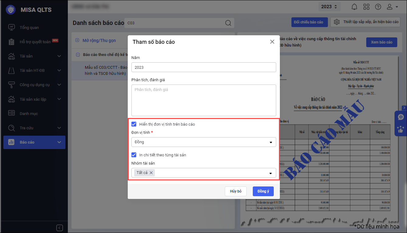 • Khi tích chọn Hiển thị đơn vị tính trên báo cáo, hiển thị thêm Đơn vị tính để cán bộ tài sản chọn.