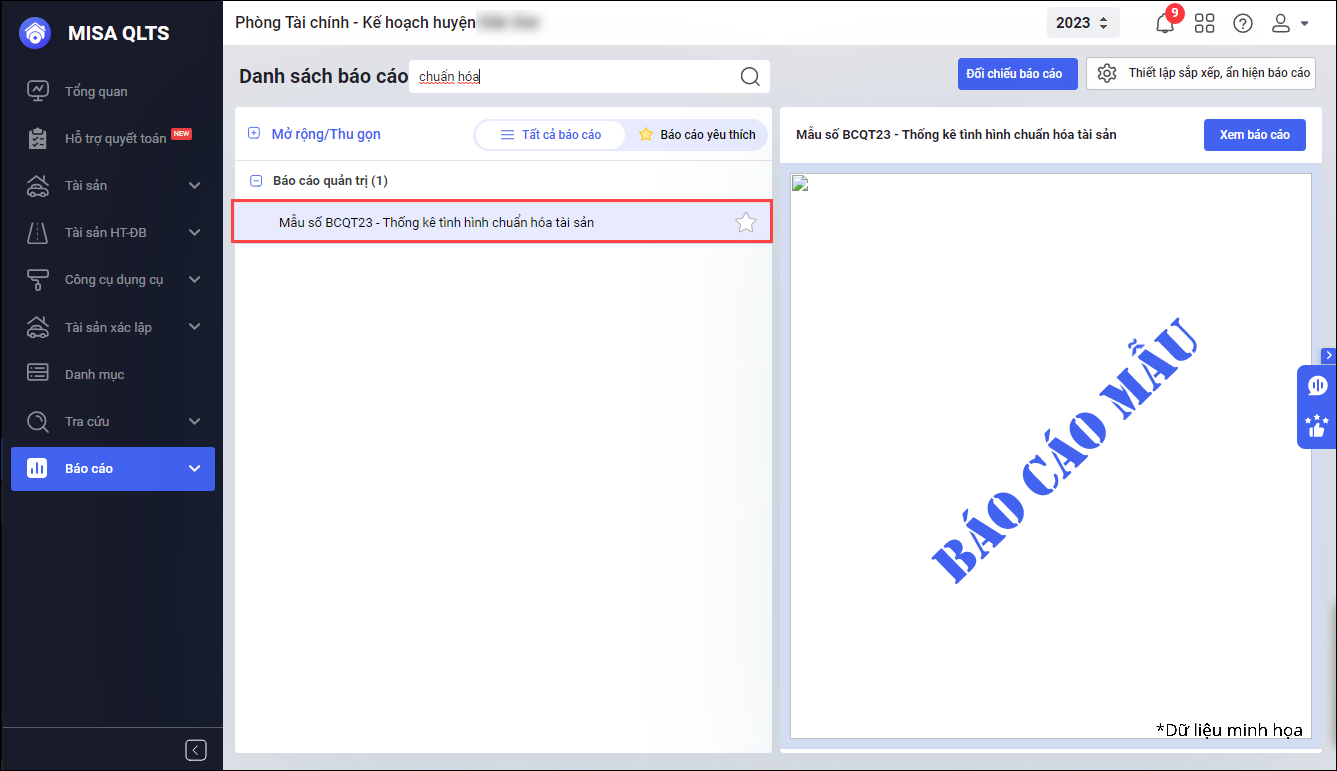 • Tại Báo cáo\Báo cáo quản trị:  Bổ sung Mẫu số BCQT23 – Thống kê tình hình chuẩn hóa tài sản.
