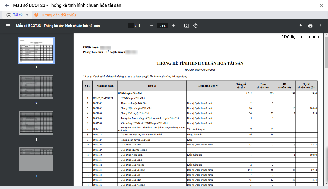 • Chuyên viên đơn vị chủ quản có thể thống kê tình số lượng tài sản đã/chưa chuẩn hóa; tỷ lệ chuẩn hóa tại chính đơn vị mình và các đơn vị trực thuộc.
