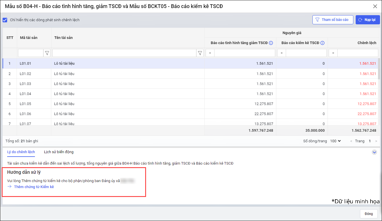• Tại Báo cáo\Danh sách báo cáo\Đối chiếu báo cáo: Bổ sung câu cảnh báo cùng điều hướng đến màn chức năng tương ứng từng nghiệp vụ chưa phù hợp với quy trình quản lý tài sản.