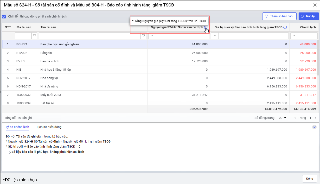 • Để đối chiếu chính xác số liệu giữa các báo cáo thì cán bộ QLTS cần thực hiện cộng trừ các cột thông tin trên báo cáo. Cán bộ QLTS thắc mắc không biết giá trị đó là được tính từ đâu, như thế nào khi kiểm tra thấy giá trị: Nguyên giá, HM/KH lũy kế; GTCL trên tính năng Đối chiếu báo cáo không khớp với số liệu trên từng báo cáo.