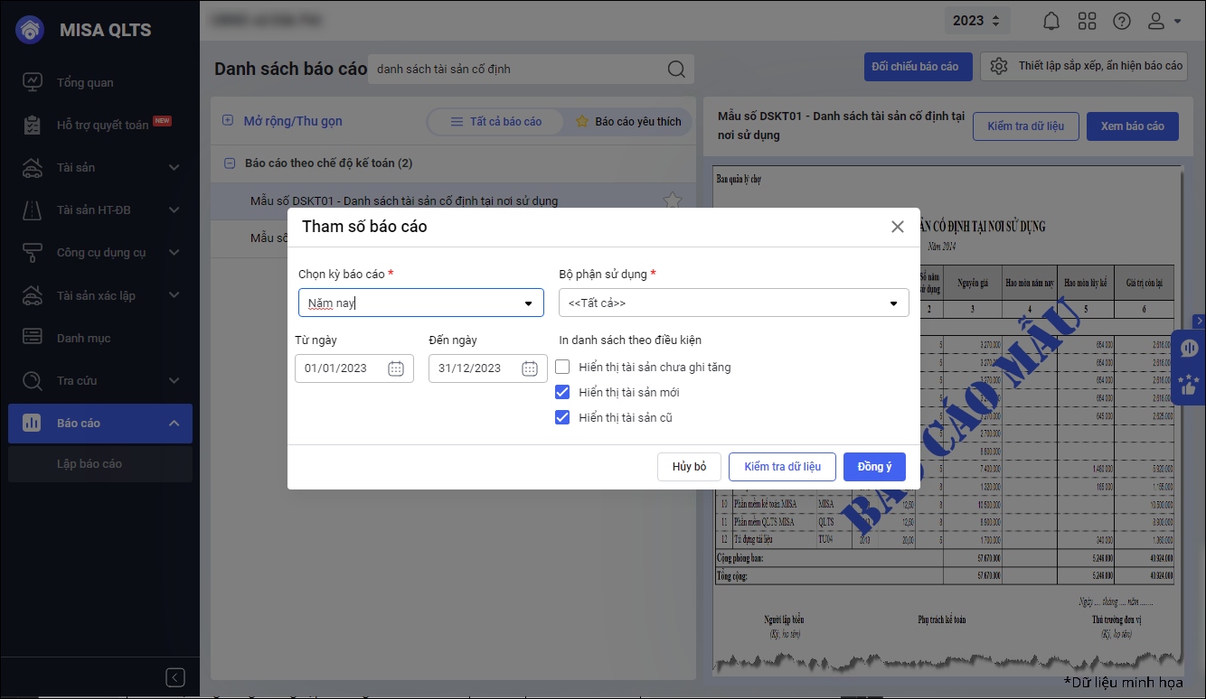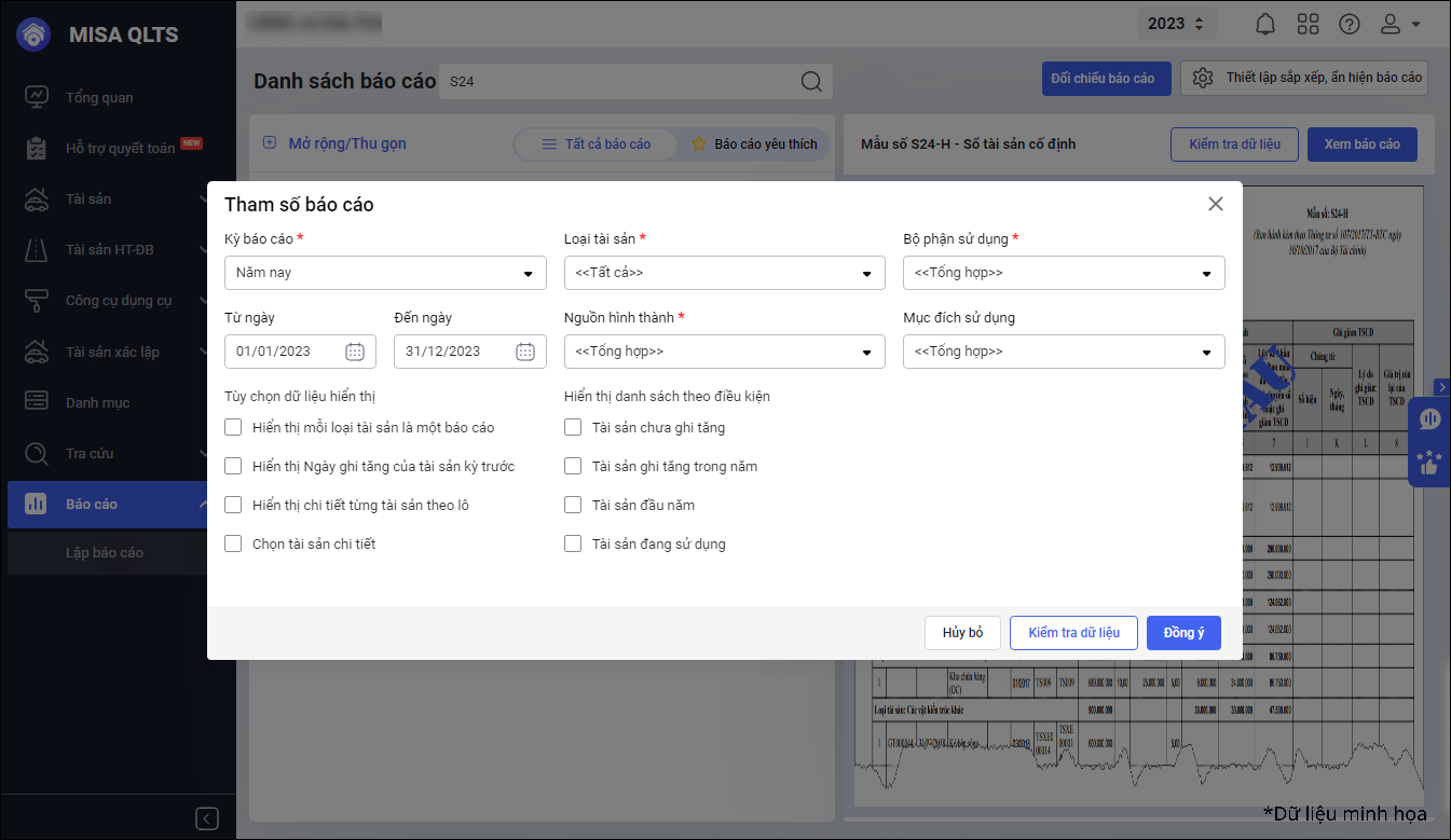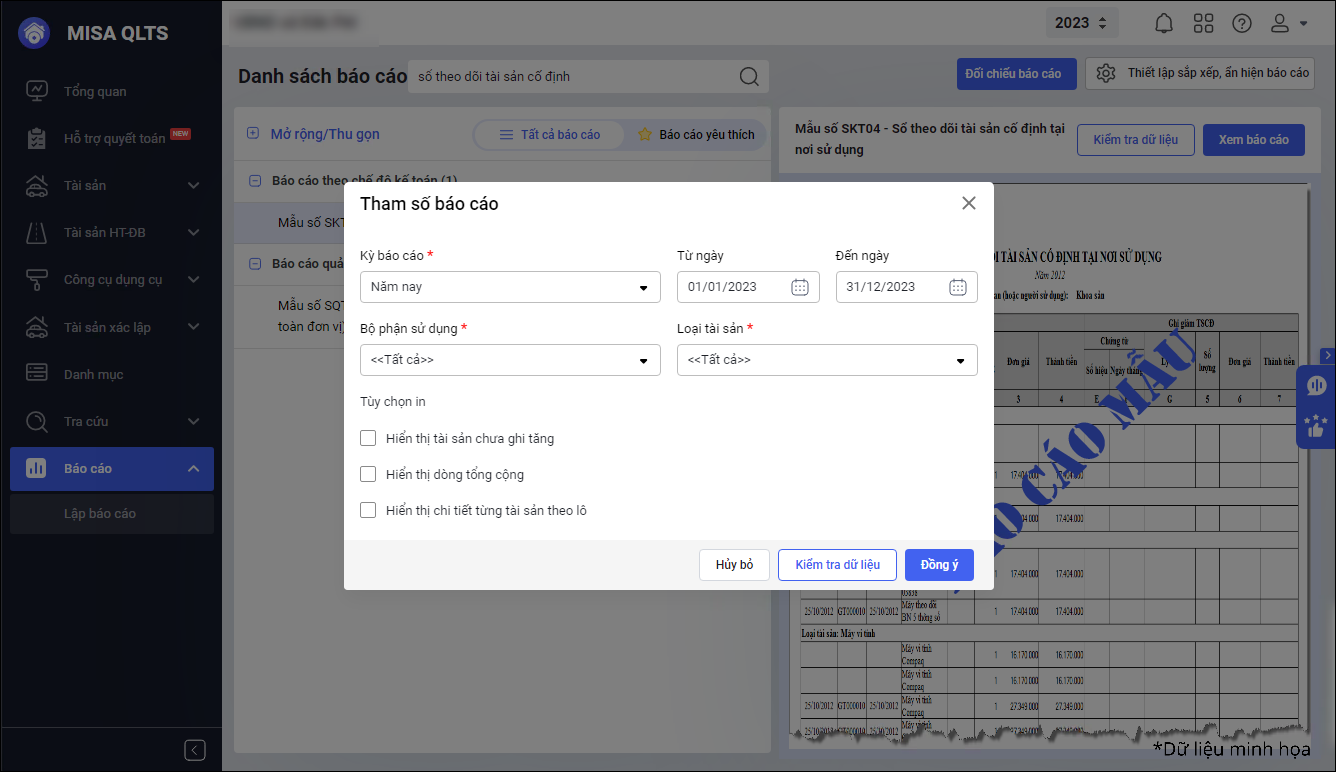 • Khi cần thay đổi các tiêu chí xem báo cáo, cán bộ QLTS có thể thực hiện thao tác nhanh chóng để tiết kiệm thời gian.