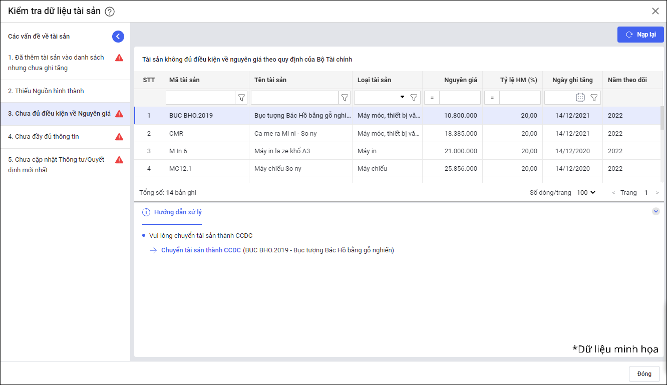 • Tại Hướng dẫn quyết toán\Kiểm tra dữ liệu tài sản\Không đủ điều kiện về Nguyên giá: Đối với tài sản con trong lô, kiểm tra điều kiện về nguyên giá như một tài sản độc lập.