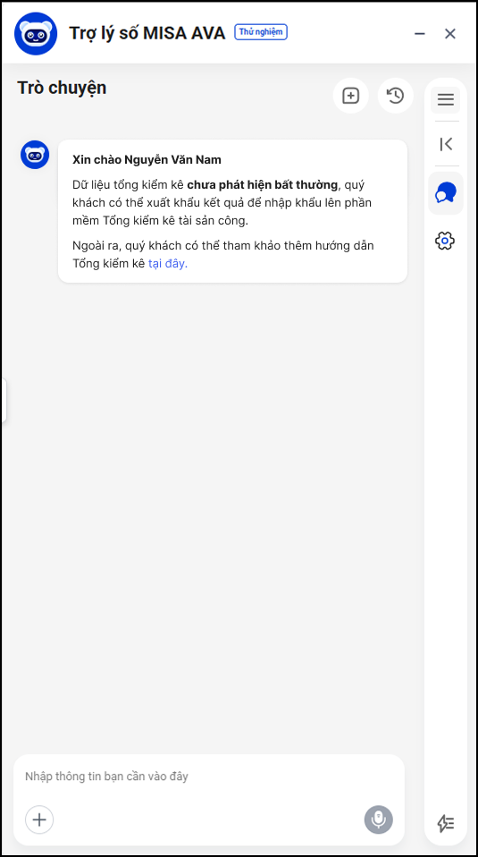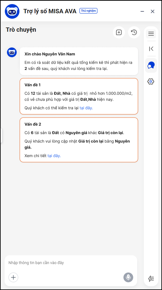 - Trợ lý số MISA AVA sẽ kiểm tra và phản hồi lại về tính hợp lệ của tài sản: