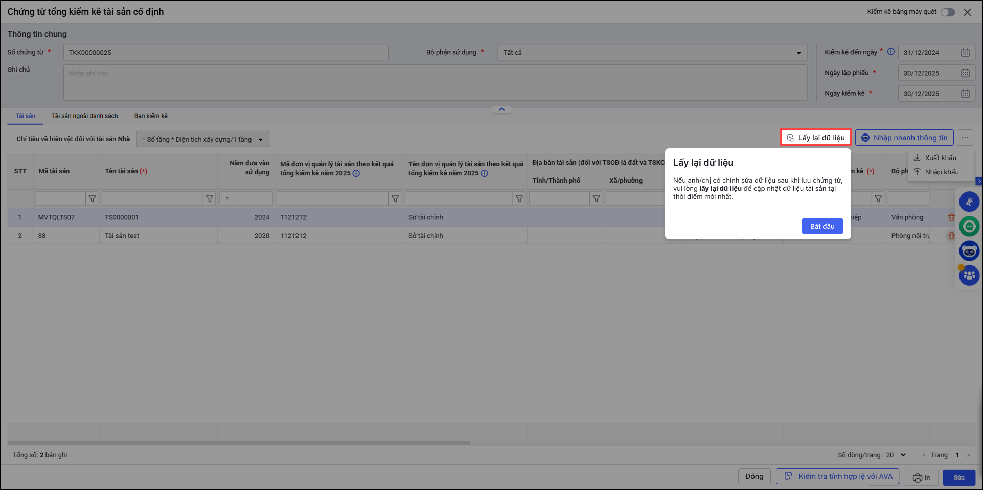 - Trường hợp anh/chị vào sửa lại chứng từ Tổng kiểm kê, phần mềm bổ sung tính năng Lấy lại dữ liệu. Anh/chị nhấn nút Lấy lại dữ liệu để cập nhật dữ liệu tài sản tại thời điểm mới nhất.