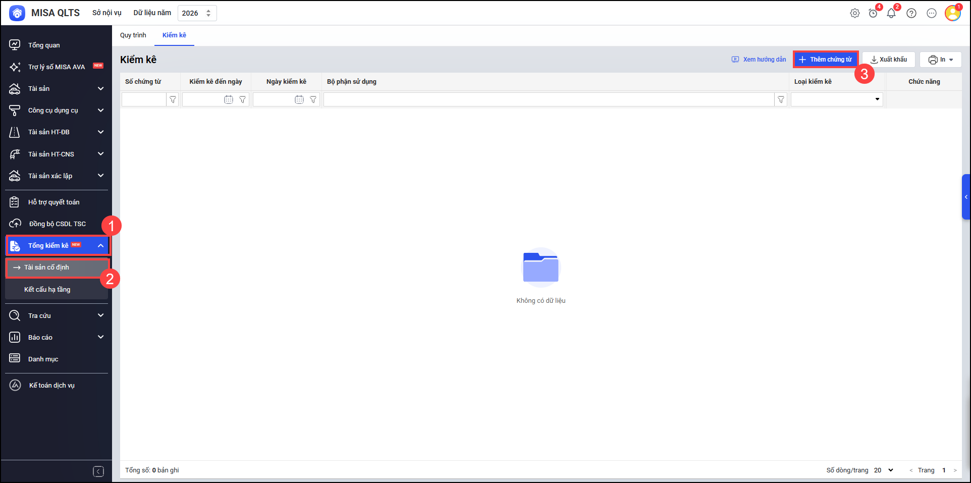 - Vào Tổng kiểm kê/Tài sản cố định. Nhấn Thêm chứng từ