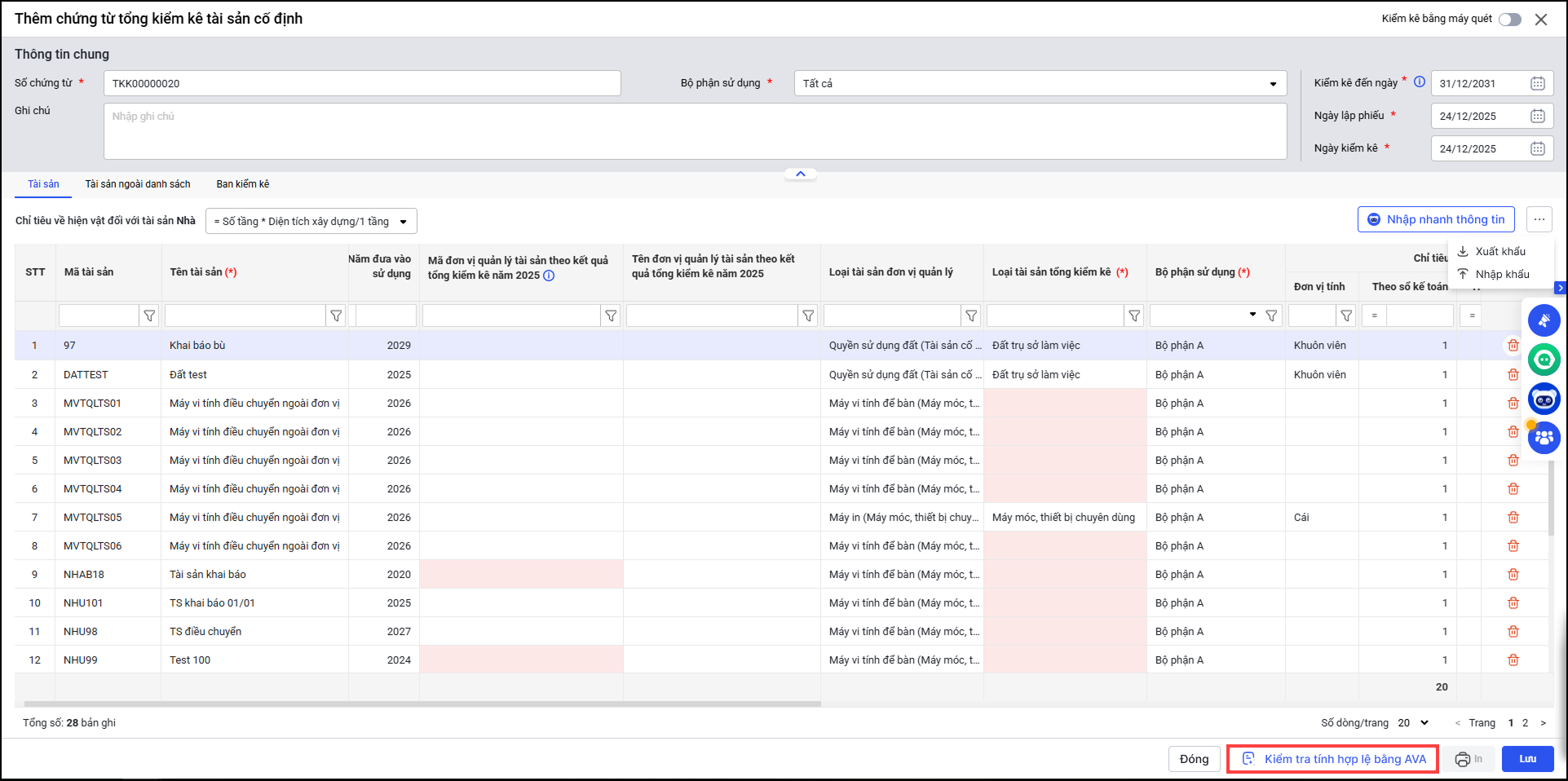 - Sau khi khai báo xong các thông tin tài sản, nhấn Kiểm tra tính hợp lệ với AVA