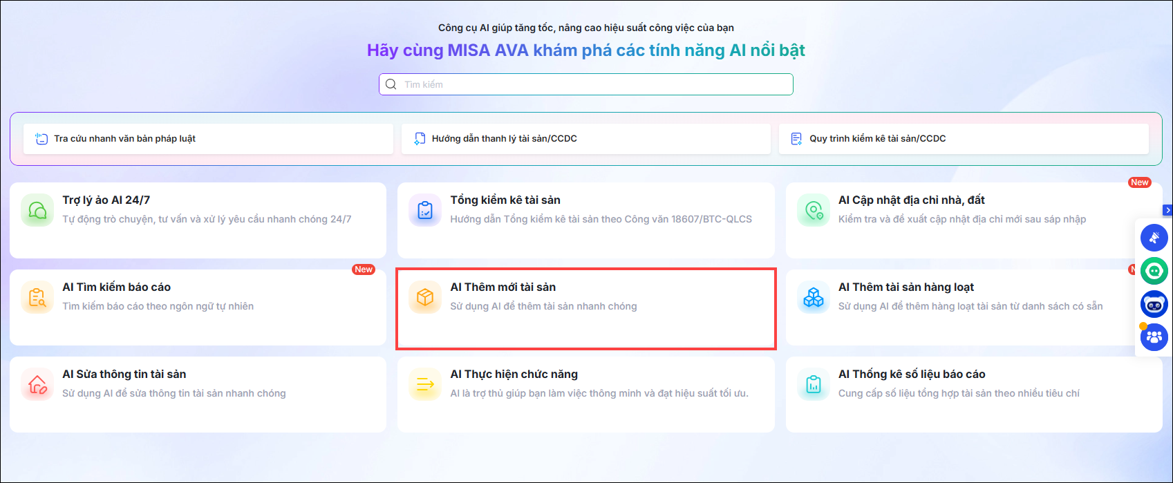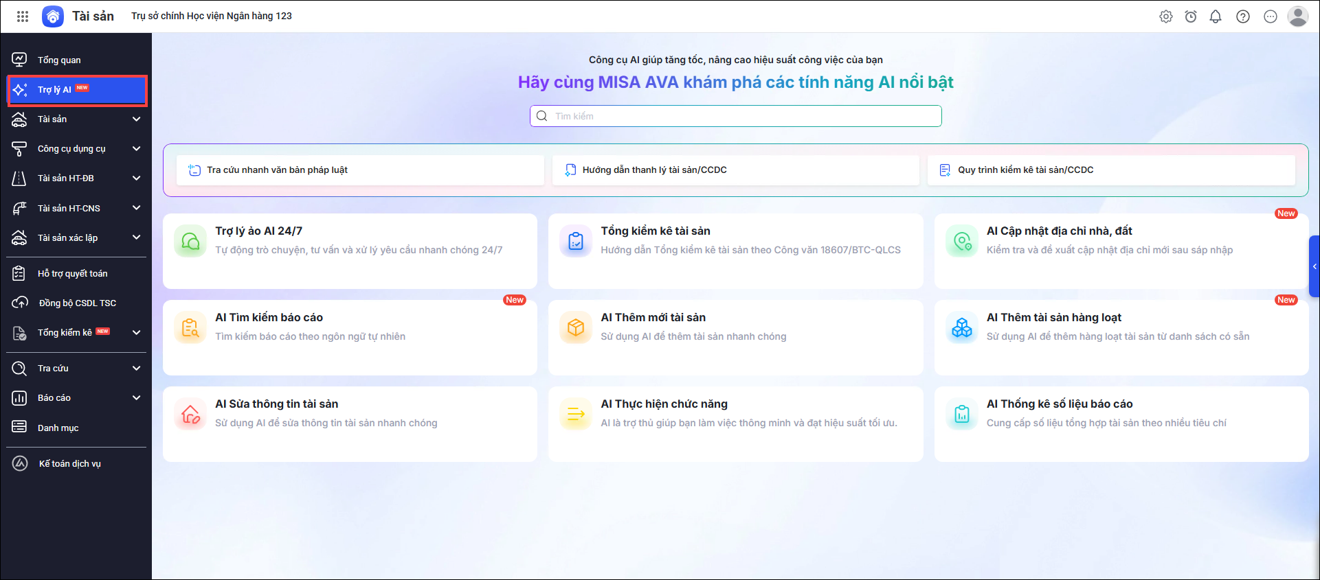 Vào Trợ lý số AI, phần mềm hiển thị tính năng AI nổi bật bao gồm: Trợ lý ảo AI 24/7; Tổng kiểm kê tài sản; AI cập nhật địa chỉ nhà đất; AI tìm kiếm báo cáo; AI Thêm mới tài sản; AI thêm tài sản hàng loạt; AI sửa thông tin tài sản; AI thực hiện chức năng; AI thống kê số liệu báo cáo…