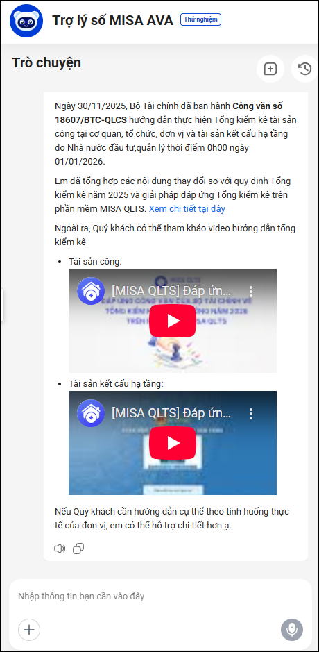 - MISA AVA gửi video hướng dẫn về tổng kiểm kê tài sản công và tài sản kết cấu hạ tầng, anh/chị nhấn xem video để xem hướng dẫn chi tiết.