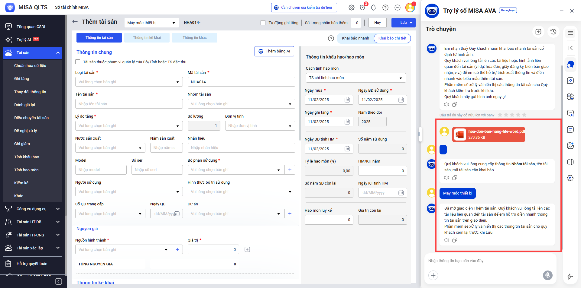 - Anh/chị tải lên hình ảnh liên quan tới tài sản trong khung chat với MISA AVA. Sau đó làm theo hướng dẫn của AVA để thực hiện thêm mới tài sản